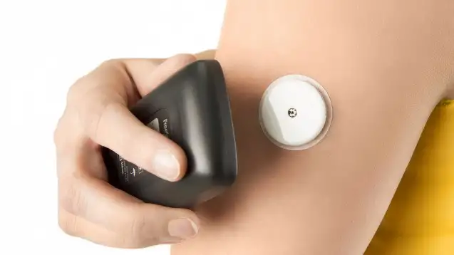 上腕部に専用センサー(コイン大の大きさ)を貼付し、14日間連続で皮下グルコース濃度を測定します。スマートフォンをお持ちの方は自身のスマホにグルコースデータ管理アプリであるFreeStyleリブレLink(無料)をインストールいただきます。測定中はセンサーよりBluetooth接続により1分毎にスマートフォンに血糖データが転送されます。