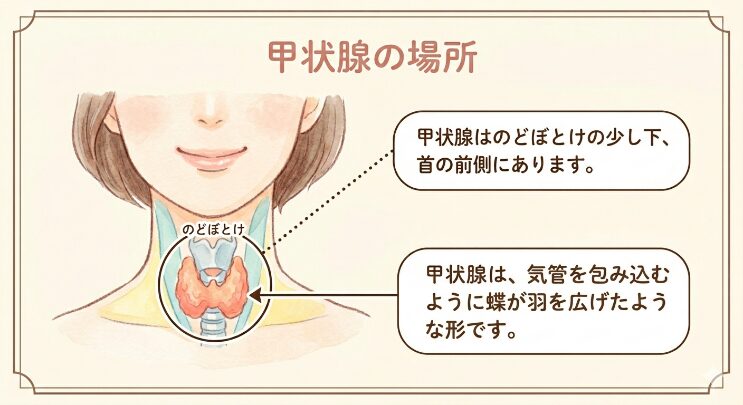 のどぼとけのすぐ下にある「甲状腺」は、蝶が羽を広げたような形の小さな臓器です。全身の代謝をスムーズにする「甲状腺ホルモン」を作る重要な役割を担っています。